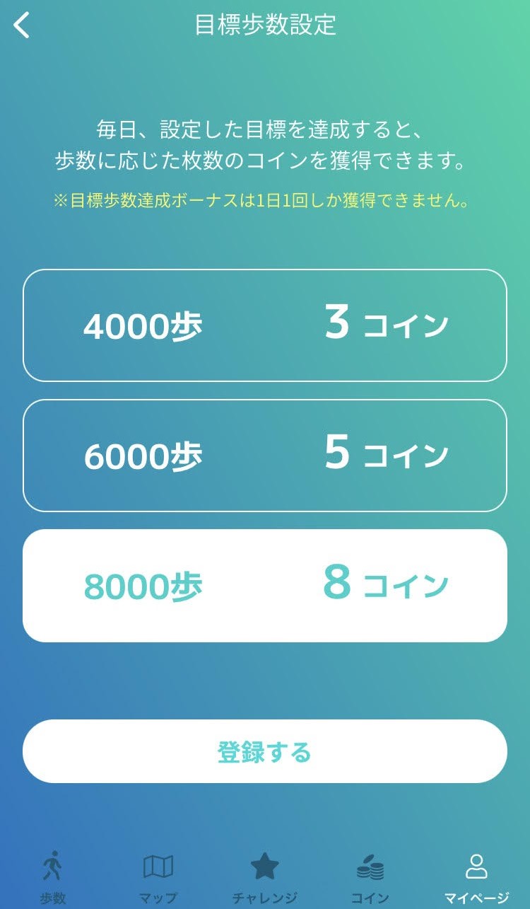 基本は目標歩数設定で設定した歩数を歩き切ると、設定歩数に乗じたコインを獲得できます。