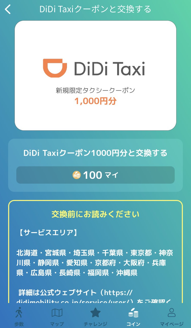 または、DiDI Taxi 100コインで初回乗車料金1000円分割引のサービスを受けることもできます。こちらは利用する方でしたら、少額のコインで交換できるので試してみては。