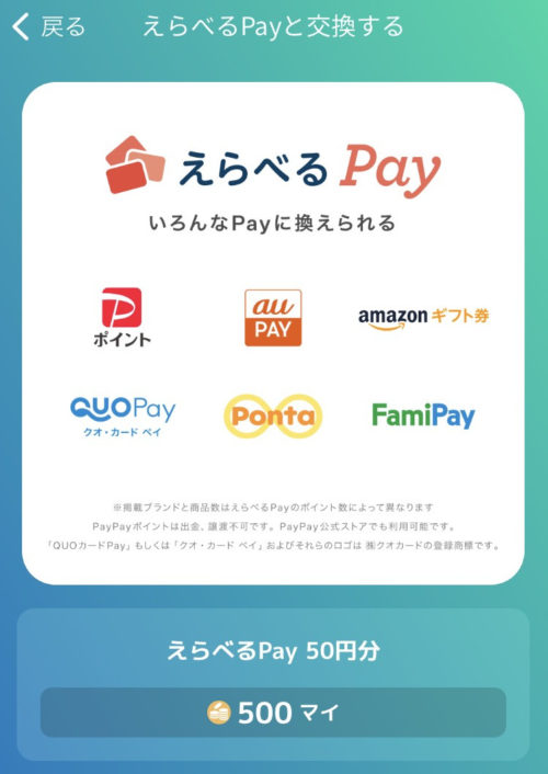 アルコインで貯めたコインは下記のポイントに交換できます。最低交換枚数は500コイン=50円分からで、下記6つの中お好きなPayに交換することができます。メインメニューのコイン→コインを使う