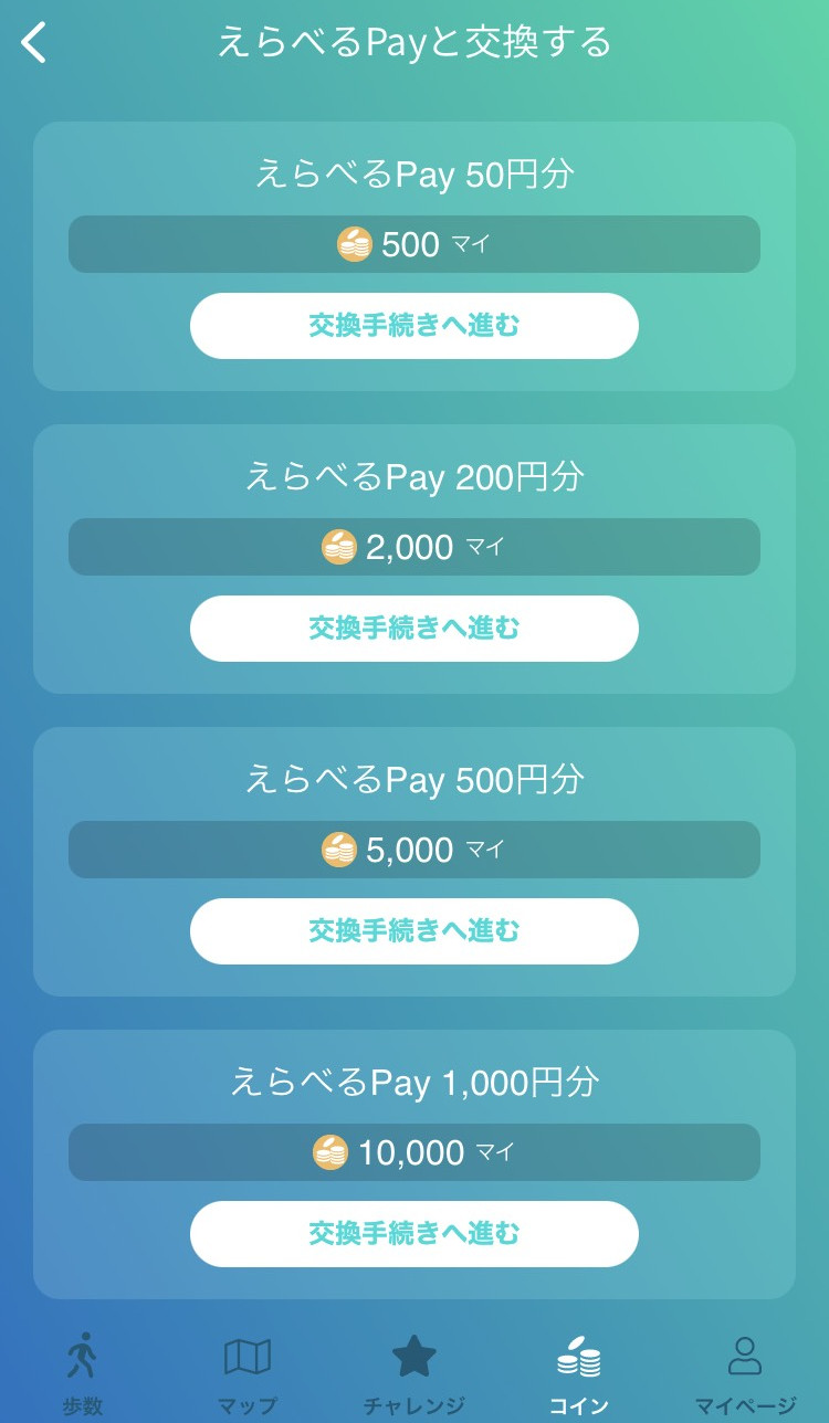 交換できる枚数は他に2000コイン=200円、5000コイン=500円とあり、枚数が増えるほど交換できる先が増えます。