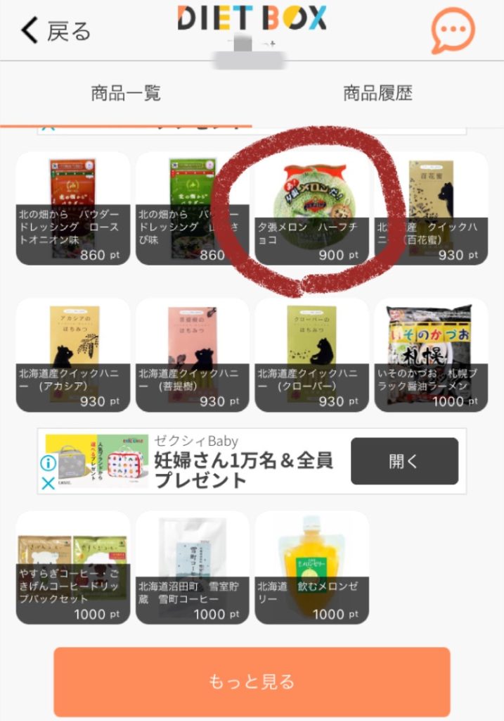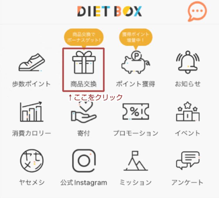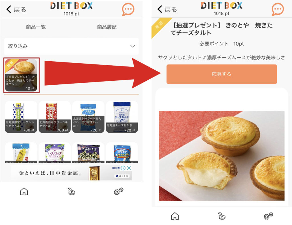 DIETBOX内の商品紹介ページボタンから、獲得ポイントに応じてお好きな商品を選ぶことができます。