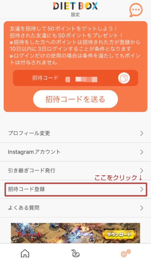 登録の際、こちらの【招待コード: F8wzqRX9を登録していただけると50pt=2,5000歩分のポイントが加算されます。下図の入力枠にペーストすればOKです。ぜひご活用ください。